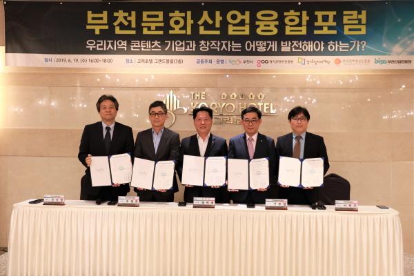 경기도일자리재단-경기콘텐츠진흥원-부천산업진흥원-한국만화영상진흥원과 부천시는 지난 19일 부천 고려호텔에서 ‘부천 첨단문화산업발전을 위한 공동협력 업무협약’을 체결하고 ‘부천문화산업융합포럼’ 발족식을 개최했다.