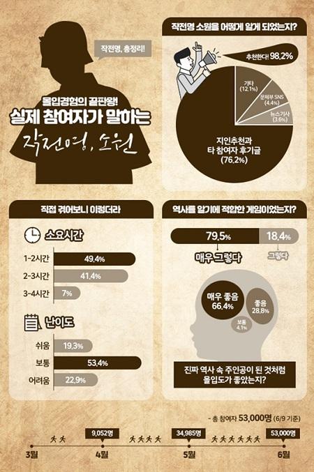특히 장시간을 프로그램에 참여한다는 시공간적 특성에도 불구하고 ‘작전명, 소원’에 대한 이들의 만족도는 유달리 높았다. 게임 참가자들에게 역사를 알기에 적합한 게임이었는지 묻는 질문에 참여자의 79.5%가 ‘매우 그렇다’고 답했으며, ‘그렇다’고 대답한 참여자도 18.4%를 차지하며 98%의 기록적인 만족도를 보였다. 또한, 진짜 역사 속의 주인공이 된 듯 몰입도가 좋았느냐는 질문에도 95%의 참여자가 ‘좋았다’고 답했으며, 게임 추천도 역시 98.2%에 달했다. 이를 반영하듯 76%의 사람들이 지인추천과 타인의 후기글을 통해 참여한 것으로 나타나 ‘작전명, 소원’의 인기를 실감케했다.