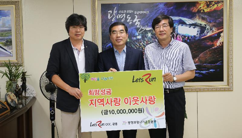 광명희망나기운동본부는 이날 기부된 성금을 광명지역의 저소득층에게 전액 전달하고, 최근 메르스로 침체된 지역경제를 살리기 위해 전통시장에서 지역특산품을 구매할 수 있는 온누리상품권을 구입했다.