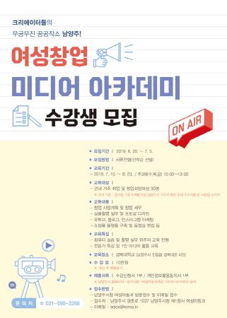 남양주시는 오는 7월 5일까지 지역내 거주 취·창업희망여성 대상으로 ‘2019 여성창업 미디어 아카데미 과정’ 참여자를 모집한다.