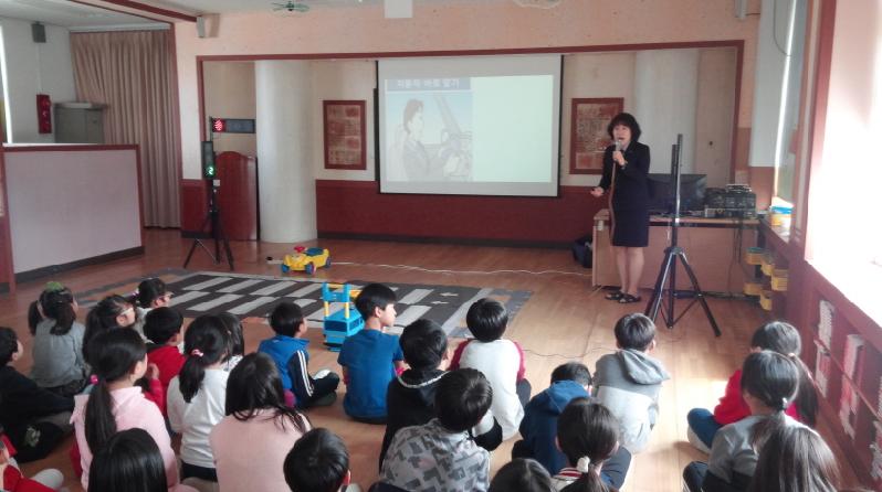 도로교통공단 경북지부 소속 교통안전지도사 김순옥 강사님의 강의로 학생들이 주변에서 흔히 겪을 수 있는 교통안전사고에 대해 알아보고 교통사고를 막고 안전하게 생활하기 위한 수칙을 배웠다. 그리고 횡단보도 5원칙 ‘멈춘다-차가오는지 왼쪽, 오른쪽을 본다-손을 든다-차가 멈추었는지 확인한다-건넌다’를 모의 횡단보도를 활용하여 직접 체험해보는 시간을 가졌다.