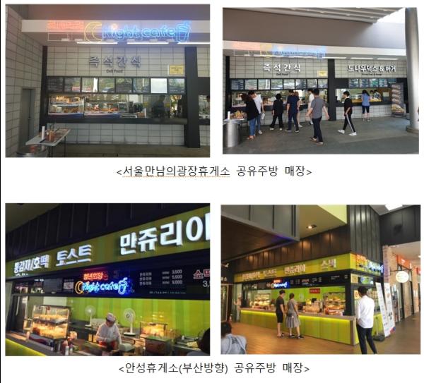 고속도로 휴게소의 공유주방 매장은 청년창업자들이 운영하며, 저렴한 가격의 원두커피, 음료와 핫바, 호두과자 등 간식 메뉴를 판매하는데, 야간 취약시간대에만 운영되는 점을 감안해 임대료가 면제되고, 수수료가 인하되는 등 다양한 혜택이 제공된다.