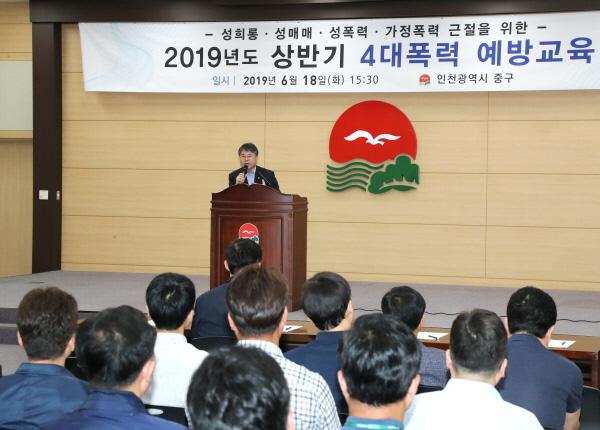 인천 중구은 지난 18일 본청 월디관 대회의실에서 전 직원을 대상으로 4대 폭력 예방교육을 실시했다.