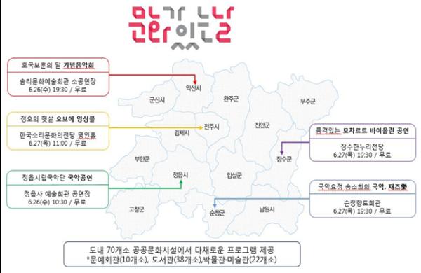도 및 시군 문예회관 10개소에서 다양한 공연행사가 진행된다. 호국보훈의 달 6월을 맞아 진행되는 ‘기념음악회’, 정오의 햇살을 맞으며 진행되는 ‘오보에 앙상블’, 정읍시립국악단의 흥명나는 ‘국악공연’, 품격있는 모차르트 바이올린연주 공연, 국악요정 송소희가 부르는 ‘국악, 재즈 樂’ 등 눈과 귀를 사로잡는 멋진 공연들이 실시된다.