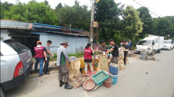 법원읍은 김선주 가야3리 이장의 지휘하에 민·관·군의 재능기부 봉사자들이 참여한 가운데 이날 5톤 이상의 짐을 정리했다.