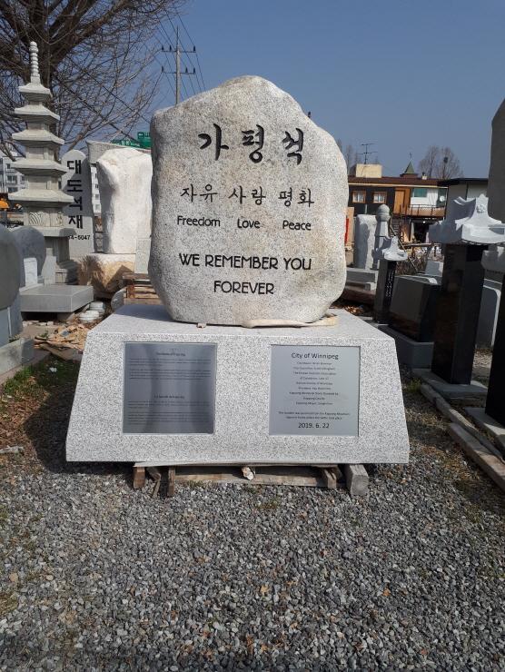 가평공원으로 명명된 추모공원은 매니토바주 한인회, 캐나다군한국전 참전용사, 위니팩시와 군이 협력해 만들어 졌다. 한국전쟁기간 캐나다군의 가평전투를 기리기 위해 조성된 것이다.