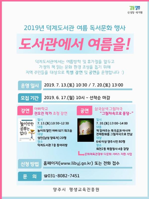 양주시 덕계도서관은 여름방학과 휴가철을 맞아 책과 함께하는 독서문화 환경 조성을 위해 오는 7월 13일과 20일 여름 독서문화 행사 ‘도서관에서 여름을’을 운영한다.