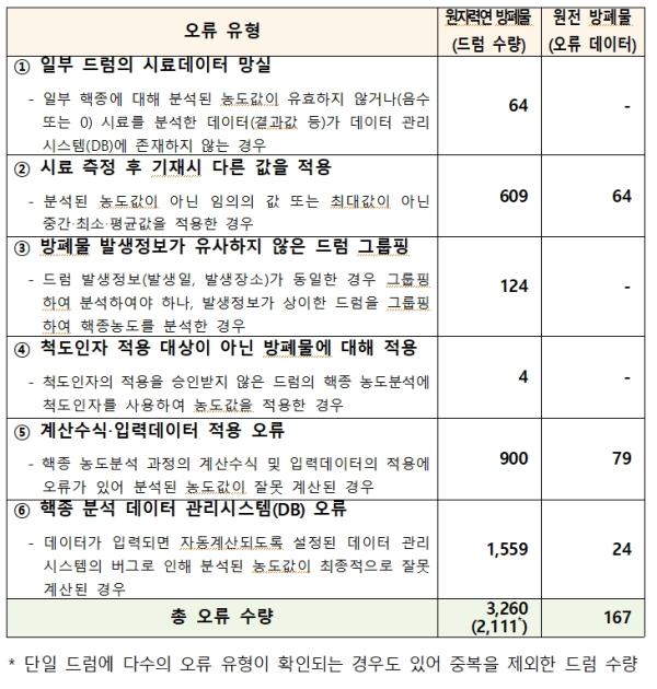 조사결과, 원자력연이 ‘15년 이후 경주 방폐장으로 인도한 방폐물 2,600드럼 중 2,111드럼에 기재한 일부 핵종농도 정보에 오류가 있었으며, 한수원이 의뢰한 원전 방폐물 분석과정에서도 3,465개의 분석 대상 데이터 중 167개 데이터에 오류가 있음을 확인했다.