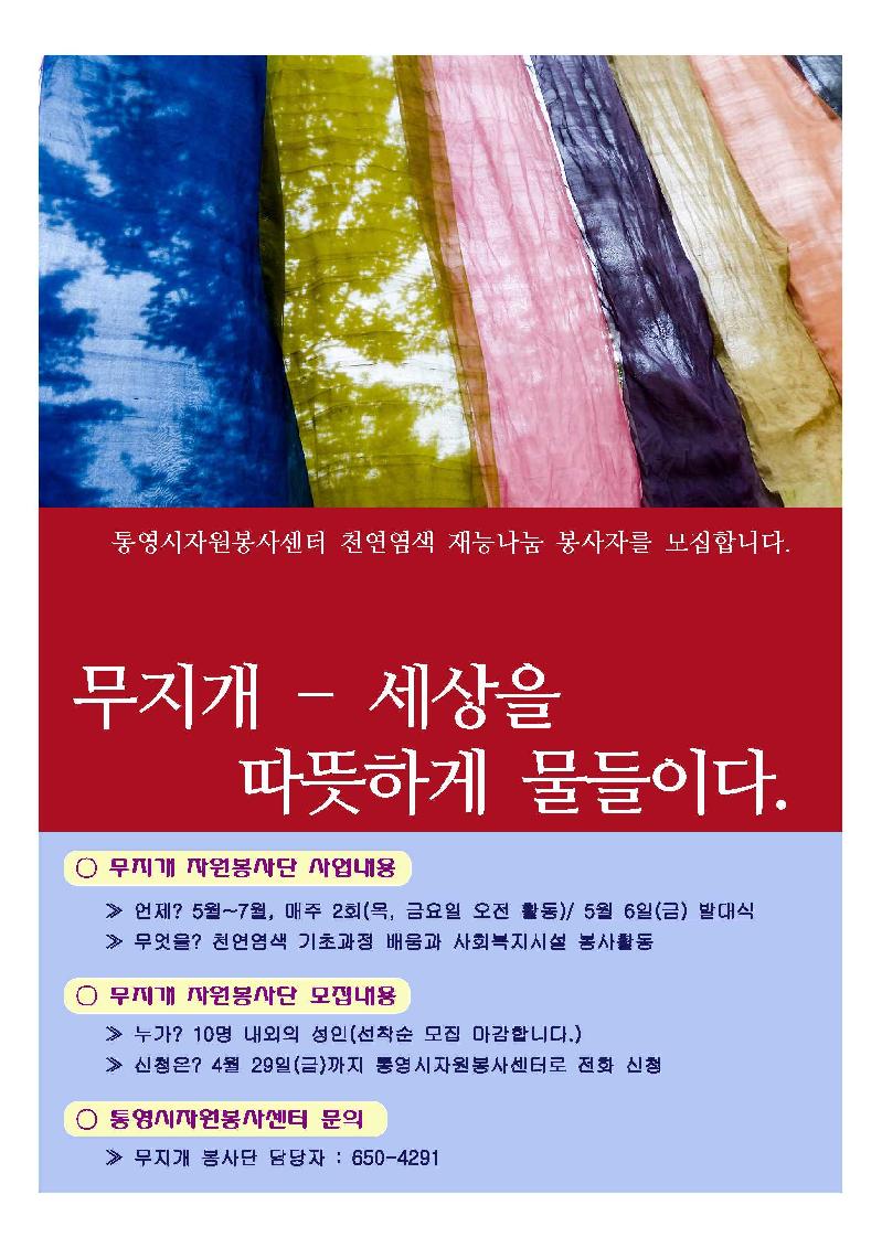 통영시자원봉사센터(시장 김동진)는 사회복지시설 및 어려운 세대에 마음의 즐거움과 아름다움을 선사하기 위해 천연염색 재능봉사단인 ‘무지개 자원봉사단’을 모집한다.