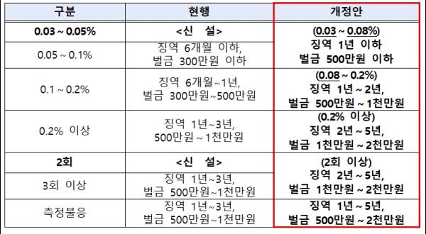 음주운전 단속기준이 강화되고, 음주운전 시 처벌 기준도 최고 징역 5년 또는 2천만 원 이하의 벌금 등으로 상향된다.
