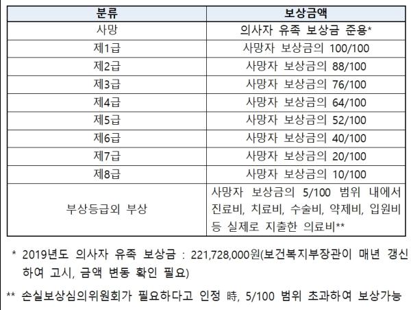 생명·신체상의 손실을 입은 경우에는 사망 또는 부상등급에 따라 보상금을 지급받을 수 있으며, 부상이 악화된 경우에는 추가적으로 손실보상금을 청구할 수 있다.