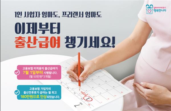 소득활동을 하고 있음에도 고용보험의 출산전후휴가 급여를 지급받지 못했던 여성도 오는 7월 1일부터는 월 50만 원씩 3개월 동안 총 150만 원의 출산 급여를 지급받을 수 있게 됐다.