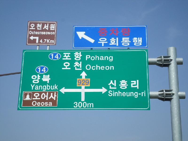 포항시는 대형차량 등으로 상습적으로 정체가 심한 오천시장 앞 지방도 929호선에 중차량 우회표지판 3개소를 설치했다. 우회표지판은 오천 중․고등학교 앞 삼거리와 지방도 929호선(신흥중학교 앞)내에 예고표지판과 본 표지판 등 총 3개가 설치되어 향후 정체구간 해소에 기여할 것으로 기대하고 있다. 건설과 관계자는 “5일마다 열리는 오천 장날과 출퇴근 시간 등 대형차량의 통행으로 정체가 심했으나, 이번 중차량 우회표지판을 설치함으로써 전통시장을 찾는 시민들이 조금이나마 불편함이 해소될 것으로 기대한다.”고 말했다.