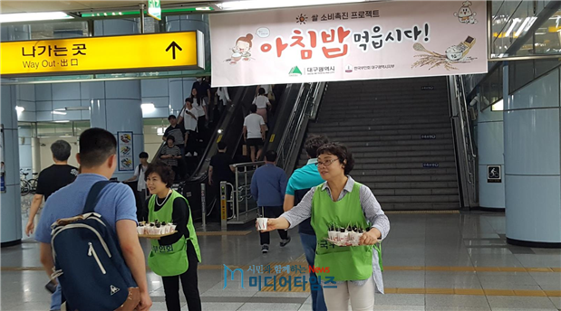 대구시와 한국부인회 대구시 지부(회장 서점복)는 21일 성서공단역에서 쌀 소비촉진을 위한「아침밥 먹읍시다」행사를 개최했다.