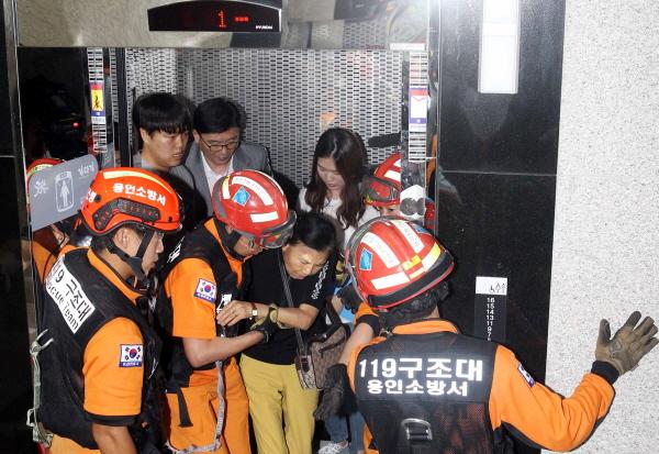 용인시는 승강기 사고나 고장 발생시 신속한 구조를 위해 24일 시 청사에서 ‘승강기 사고대응 합동훈련’을 했다.