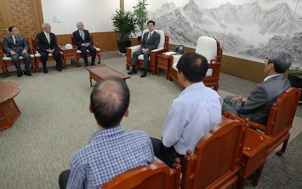 양승조 충남도지사는 호국보훈의 달을 맞아 24일 도청 외부인사 접견실에서 유병준 이북도민회 충남연합회장을 비롯한 도내 도민회장과 시·군 회장을 접견했다.