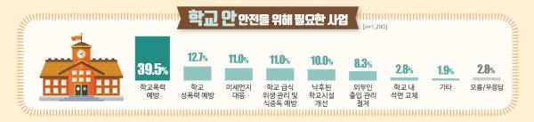 학교 안 안전을 위해 필요한 사업으로는 ‘학교폭력 예방’, ‘학교 성폭력 예방’, ‘미세먼지 대응’을 꼽았다.