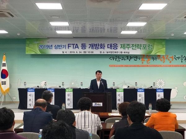 ‘2019년도 상반기 FTA 등 개방화 대응 제주전략포럼’에는 정용호 농림축산식품부 동아시아무역협정과장의 ‘FTA 농업협상 대응’을 주제로 한 기조강연을 시작으로, 김화년 제주대학교 교수의 ‘글로벌 보호무역주의 시대의 제주농업’과 기해경 한국해양수산개발원 전문연구위원의 ‘통상 환경 변화에 따른 제주 수산업의 나아갈 방향’에 대한 주제발표가 진행됐다.