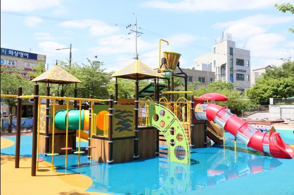 덕의근린공원 물놀이장은 400㎡ 규모로 조합놀이대, 워터드롭, 물놀이 시소, 벽천분수 등을 갖췄다.