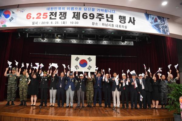 하남시는 25일 시청 대회의실에서 대한민국 6.25 참전 유공자회 경기도지부 하남시지회가 주관해 보훈단체장, 안보단체장, 유관기관장 및 보훈가족 등 300여명이 참여한 가운데 ‘6.25전쟁 제69주년 행사’를 개최했다.