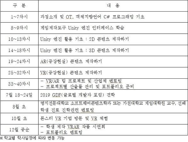 청소년 VR/AR 교실은 ,콘텐츠 기획 ,VR/AR 기초 이론 ,프로그래밍을 통한 콘텐츠제작 ,관련 기업 탐방 및 멘토링 등의 프로그램으로 구성된다. 교육과정이 모두 끝나는 12월에는 교육받은 학생들의 ‘VRAR 콘텐츠 제작 발표회’가 열릴 예정이다. 이 자리에는 VRAR 전문가는 물론 도내 VRAR기업의 담당자들도 참여해 학생들이 개발한 콘텐츠에 대한 조언은 물론, 진학·취업 상담도 진행하게 된다.