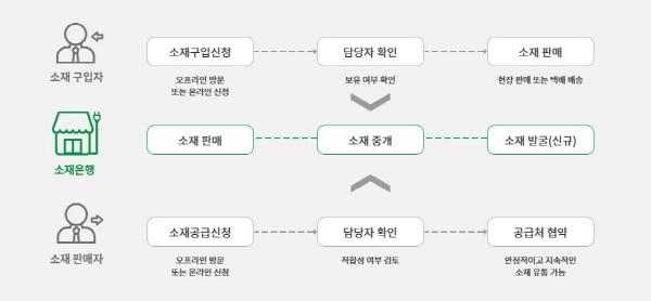 소재은행은 보유하고 있지 않은 소재에 대해 별도의 중개수수료 없이 해당 소재의 공급이 가능한 중개업체와 구매를 원하는 개인 또는 사업자를 연결하는 역할도 한다. 이를 통해 건강한 자원순환이 될 수 있는 새활용 산업 플랫폼을 구축하는 것을 목표로 하고 있다.