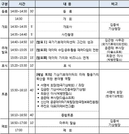 토의자로는 최광선 이사 윤준태 부사장 신신애 팀장 주진오 대표 김금란 기상서비스진흥국장이 참석한다.