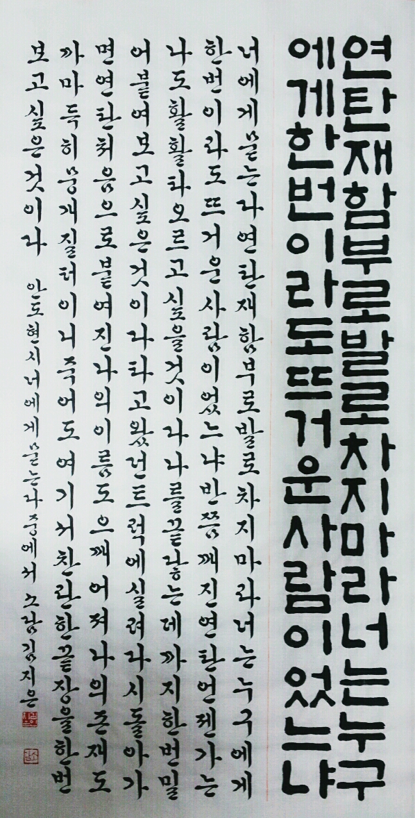 한국서가협회가 주최한 2016년 “제24회 대한민국 서예전람회“에서 통영시 명정동에 근무하는 사회복지담당 공무원인 김지은씨(2015년 입사)가 지난 15일 한글부문 특선에 당선되었다. 한편 당선작품은 2016. 5. 13. ~ 5.19. 서울 예술의 전당 서예박물관에서 전시한다.