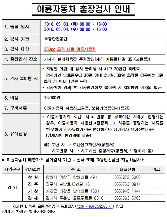 정기검사는 교통안전공단 지정검사소 전국 59개소(경남: 창원, 진주, 김해, 거창)에서만 받을 수 있어, 거제시의 대형 이륜자동차 소유자의 수검 불편 해소를 위해 거제시 주민생활국장(권태민)은 교통안전공단과 협의하여 2016년 5월 3일(화) 09시~18시까지, 5월 4일(수) 09시~16시까지 거제시 실내체육관 주차장에서 출장검사를 실시할 예정이다. 주소지가 거제시 소유자뿐만 아니라 통영 등 가까운 지자체인 경우에도 검사가 가능하다.