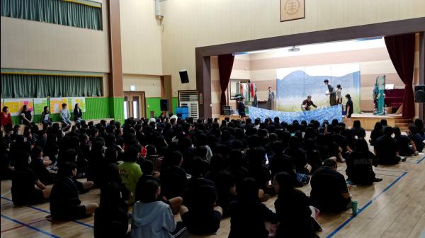 ‘쿠니 아리랑’은 미공군 폭격장으로 고통받은 매향리의 비극적인 실화를 그린 연극으로, 관객의 참여를 통해 평화의 소중함을 생각해보는 형식으로 구성됐다.. 4월 29일 하길중학교를 시작으로 6월 25일 송산고등학교까지 관내 8개 학교에서 상연되었으며, 약 1,600여 명의 학생과 교사들이 관람했다.