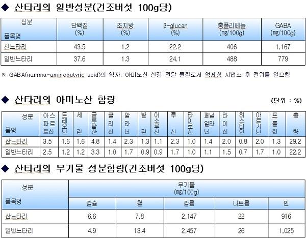 새로 개발된 산타리버섯은 조직이 쫄깃쫄깃하고 고기 질감을 가지고 있다는 특징이 있다. 시장에선 고기느타리버섯으로 유통되고 있으며, 일반 느타리버섯보다 단백질, 칼슘, GABA 및 아미노산 함량이 높다. 특히 주요 맛성분인 글루탐산 함량이 높아 식미가 우수하다.