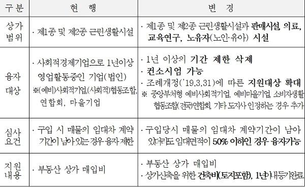 이밖에도 구입 당시 매물의 임대차 계약이 남아있을 경우, 융자금으로 매입한 면적의 50% 이하를 계속 임대할 수 있도록 했으며, 기존의 상가를 구입하는 비용 이외에도 상가신축을 위한 토지 및 건축비도 융자받을 수 있게 되는 등 전반적인 요건이 완화됐다.