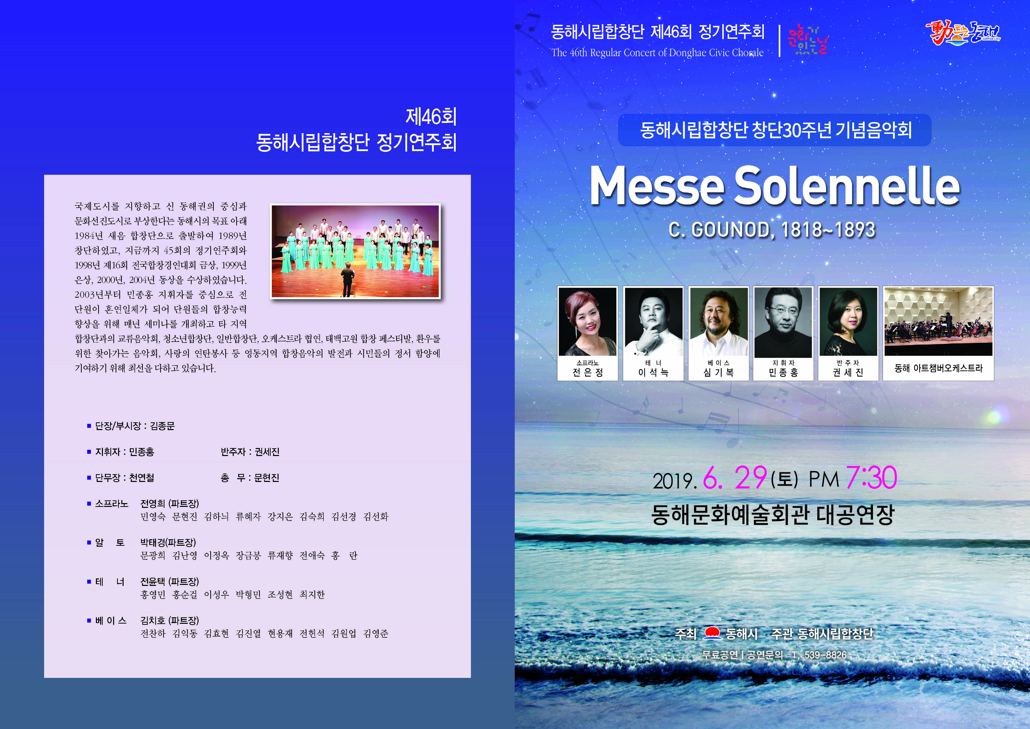 이번 정기연주회는 동해시립합창단 창단 30주년을 맞이해 고전과 전통미를 느낄 수 있는 전통 합창 명곡 ‘구노의 장엄미사’를 주제로 아름다운 선율과 감미로운 하모니를 선사할 예정이다.