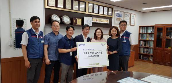 ㈜예스코는 지난 26일, 남양주시청 복지국장실에서 4개 권역 희망케어센터에 저소득 청소년 교복지원을 위한 후원금 300만원을 전달했다.