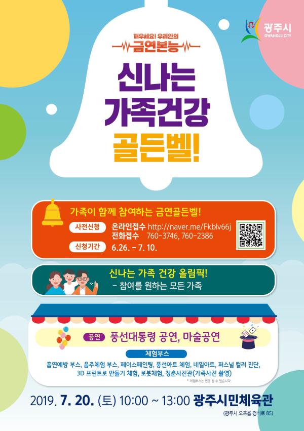 오는 7월 20일 광주 시민체육관에서 열리는 가족건강 골든벨은 청소년 흡연예방과 학부모 금연에 대한 인식을 제고하기 위해 가족단위로 참여하는 흡연예방 위주의 퀴즈 프로그램으로 초등학생 1인을 포함한 가족 2명이 2인1조로 참여 가능하다.
