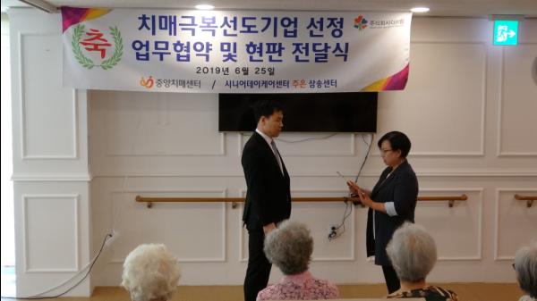 고양시 덕양구보건소 치매안심센터는 시니어데이케어 주은 삼송센터와 지난 25일 치매극복선도기업 지정 현판식을 가졌다.