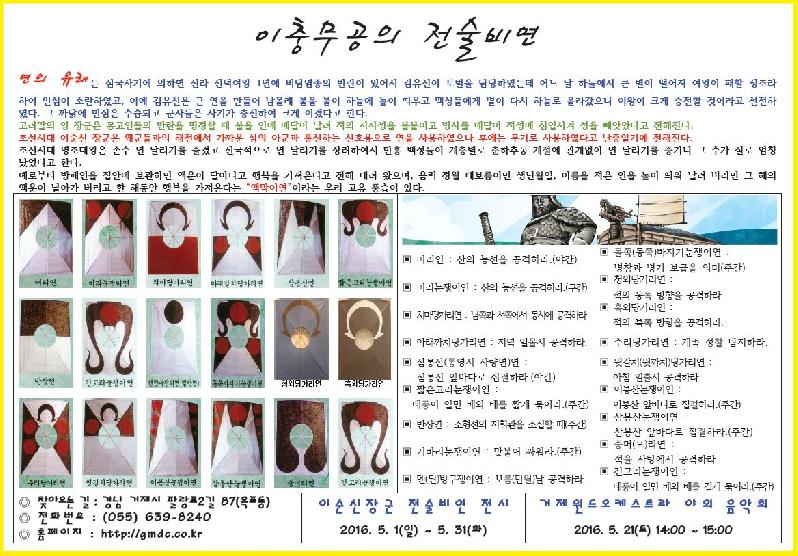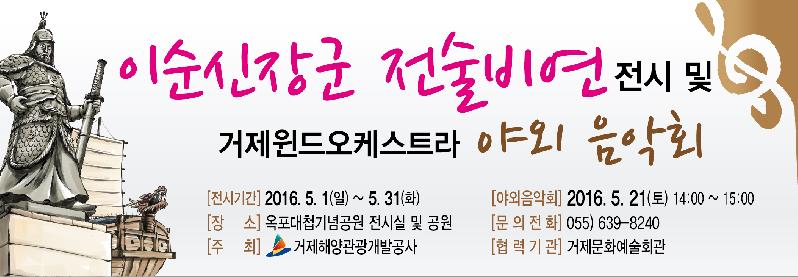 전술비연 전시는 오는 5월 1일부터 한 달간 개최하며, 거제윈드오케스트라 야외음악회는 5월 21일(토) 오후 2시에 진행한다.