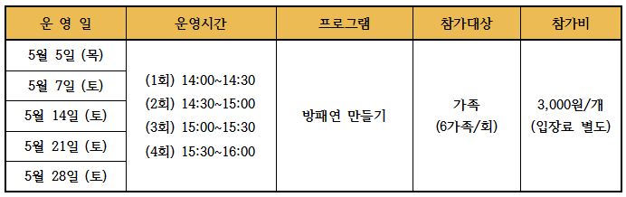 전술비연이 전시되는 동안, 5월 5일 어린이날을 비롯해 매주 토요일마다 가족과 함께 연 만들기 체험프로그램도 함께 운영한다. 참가대상은 어린이를 동반한 가족(6가족/회)이며, 체험비는 3,000원이다.