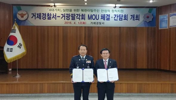 거제경찰서(서장 김영일)와 거광팔각회(회장 박영철)는 지난 12일, 경찰서 3층 강당에서 상호간 협업을 통해 북한이탈주민에게 장학· 취업 등 지원 역량을 극대화하여 대한민국 사회에 안정적 조기정착 기여의 일환으로 업무협약(MOU)을 체결했다.