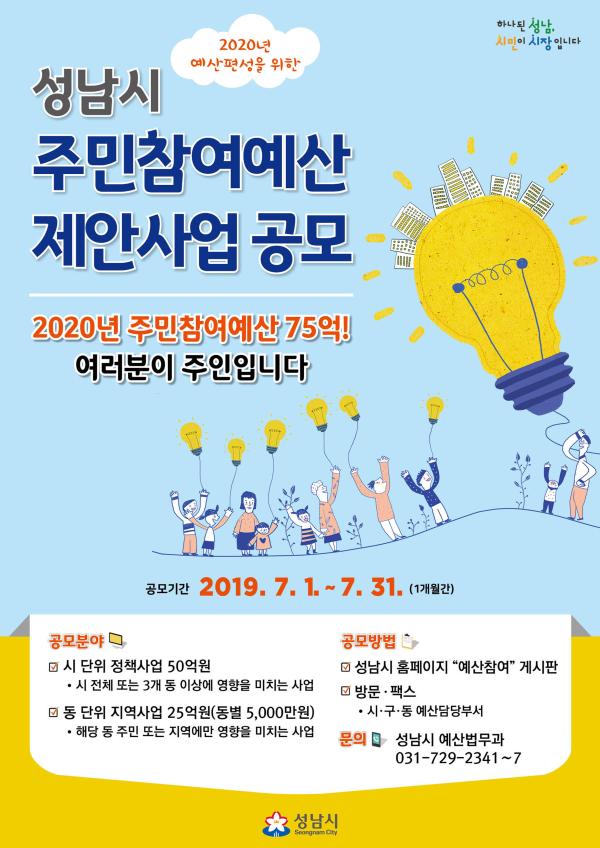 성남시는 내년도 예산 편성에 반영하려고 7월 한 달간 ‘주민참여예산 제안사업’을 공모한다.