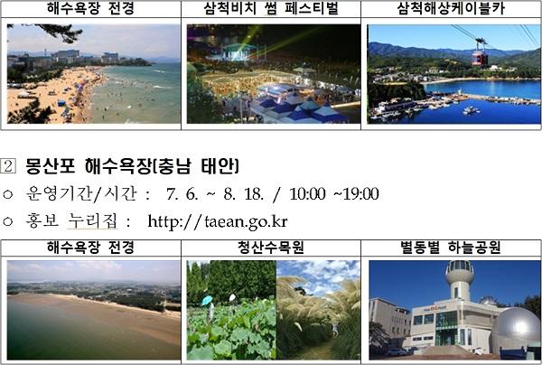몽산포 해수욕장은 백사장이 3km에 이르고 솔밭에 둘러싸여 있는 아름다운 해수욕장으로, 올해 7월 6일부터 8월 18일까지 개장한다. 이 해수욕장은 태안해안국립공원에 위치하고 있어 자연환경이 잘 보존되어 있고, 인근에 바다가 보이는 풀장과 갯벌체험지, 허브농원, 수목원, 쥬라기박물관 등이 있어 가족과 함께 방문하기 좋다.