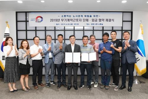 이날 협약은 “노동조합 및 노동관계조정법”상 2019년 단체협상 교섭대표노동 조합인 ‘김포시청 금사모 노동조합’과의 6차례 실무교섭 끝에 노사공동의 상생발전을 위해 협약을 체결하게 됐다.