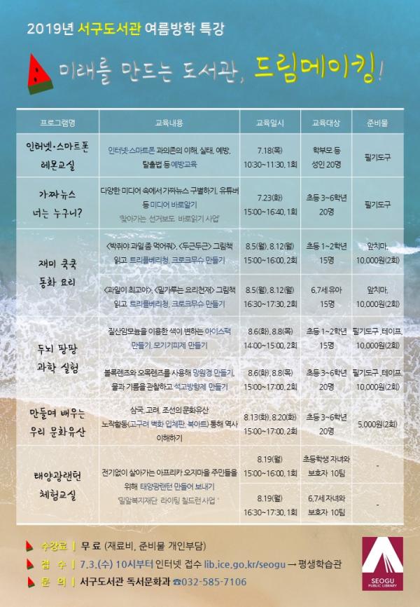 인천광역시서구도서관에서는 어린이들이 여름방학을 도서관과 함께 알차게 보낼 수 있도록 2019년 여름방학 특강을 운영하고, 오는 7이 3일부터 참가자를 모집한다.