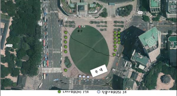 서울광장에 뜨거운 태양을 피해 잠시라도 쉬어 갈 수 있는 ‘천연그늘’이 생겼다. 잎이 크고 많아 그늘로서 효과적이라고 알려진 단풍나무와 느티나무 총 20주를 화분에 심어 광장 위에 ‘나무 숲’으로 조성한 것. 광장은 다양한 행사가 열리는 장소인 만큼 이동식 화분에 심는 방식으로 만들어졌다.