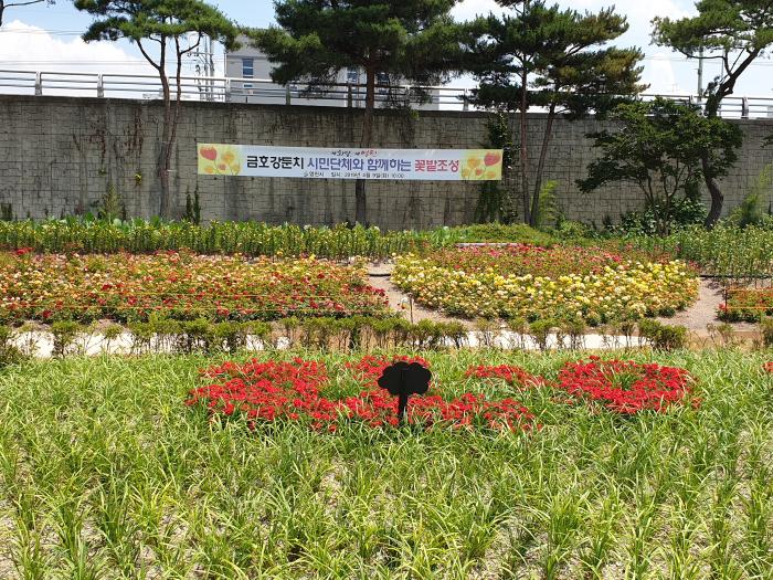 계속되는 가뭄속에서도 시민단체의 지역사랑과 봉사정신으로 물주기 및 풀뽑기 등 지속적인 관심과 관리로 채송화, 봉선화, 해바라기 등 개화를 시작했고 다알리아, 백합, 칸나, 맨드라미 또한 꽃망울을 피울 준비를 하고 있으며, 금호강변을 따라 조성된 자전거도로 옆으로는 코스모스가 가을을 기다리고 있다.