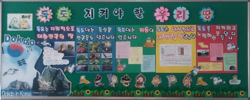 이 수업을 통해 학생들은 정보를 찾고 나누며 독도 관련 자료와 보고서를 작성하였고, 그 학습결과들을 모아 “우리가 만드는 독도전시회”를 열었다. 본교는 면지역의 소규모 학교라 주로 대도시에서 이루어지는 독도 관련 전시회를 참관할 기회가 없다. 따라서 학생들이 스스로 만들어가는 독도전시회를 구상하였고, 학교 주도의 인쇄물을 전시하는 것이 아니라 수업을 통해 만들어낸 학습결과물들로 채워나갔다. 지금도 오량초의 2층 복도에는 소박하지만 작은 독도전시회가 열리고 있는 중이다.