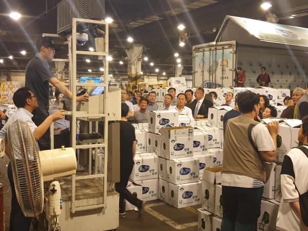 경매가 시작하기 전 정 군수는 “더운 날씨에도 농업현장 일선에서 고생하시는 양평부추농가 여러분의 노고에 감사드린다. 힘들게 생산한 양평부추가 유통현장에서 적절한 평가를 받을 수 있도록 상인 여러분들의 도움을 부탁 드린다”며 가락도매시장 상인들의 노고에도 감사를 전했다.
