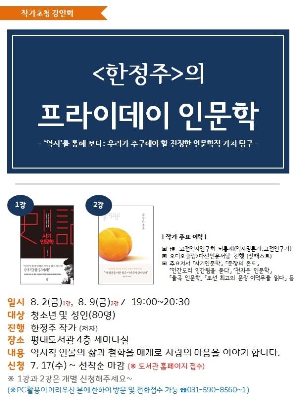 남양주시는 오는 8월 2일, 9일 평내도서관에서 작가초청강연회 ‘한정주의 프라이데이 인문학’을 개최한다.