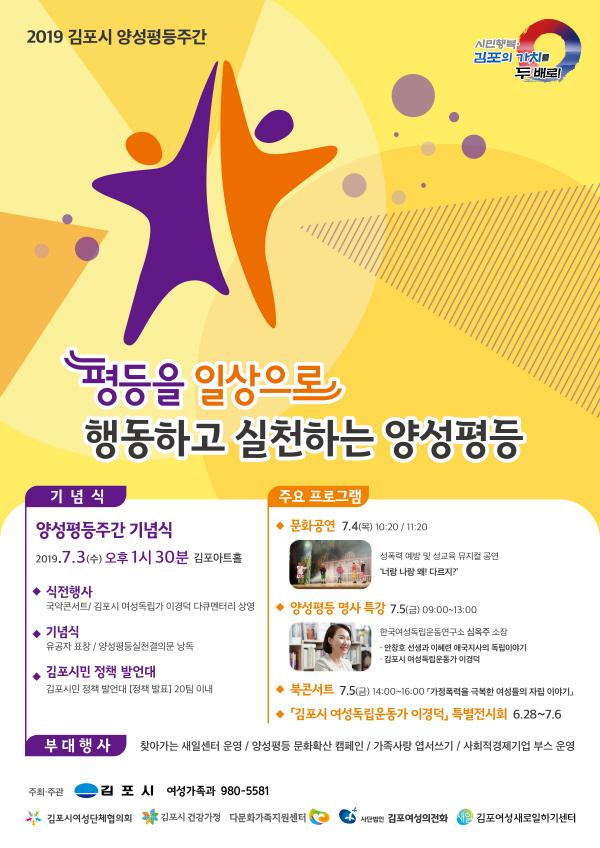 김포시는 양성평등주간을 맞아 오는 3일부터 5일까지 김포아트홀에서 ‘2019년 김포시 양성평등주간 기념행사’를 진행한다.
