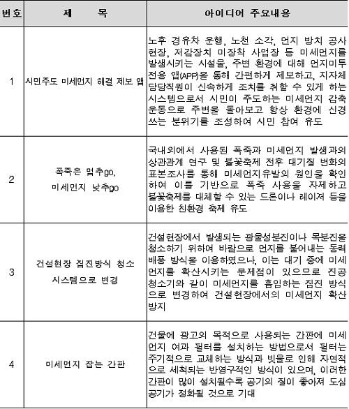 우수작에는 시민의 자발적 참여방법부터 미세먼지 발생의 한 원인이지만 평소 문제의식 없이 간과해 왔던 불꽃놀이, 건설현장 청소방식 개선, 간판 활용까지 전문적이지는 않지만 주변 환경의 개선을 통해 미세먼지를 저감할 수 있는 생활 속 아이디어가 선정됐다..